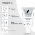 Transparent Sense SPF50+ sopii kaikille ihotyypeille silkkisen ja värittömän koostumuksensa ansiosta. Tuotteessa on kevyt tuoksu. Suositellaan erityisesti herkälle & kuivalle iholle tai kokonaan väritöntä UV-suojatuotetta etsivälle. Pro-Layer teknologian ansiosta voide imeytyy täydellisesti aiemmin levitettyjen hoitotuotteiden (seerumi, voide jne.) päälle ilman rullautumista: eli tuote toimii myös erinomaisesti meikinalusvoiteena. Tuotteen koostumus ja ihotuntuma on todella tärkeässä roolissa ja sen vuoksi voide on kehitelty mahdollisimman miellyttäväksi & nopeasti imeytyväksi.